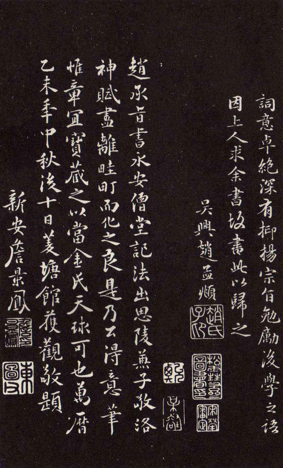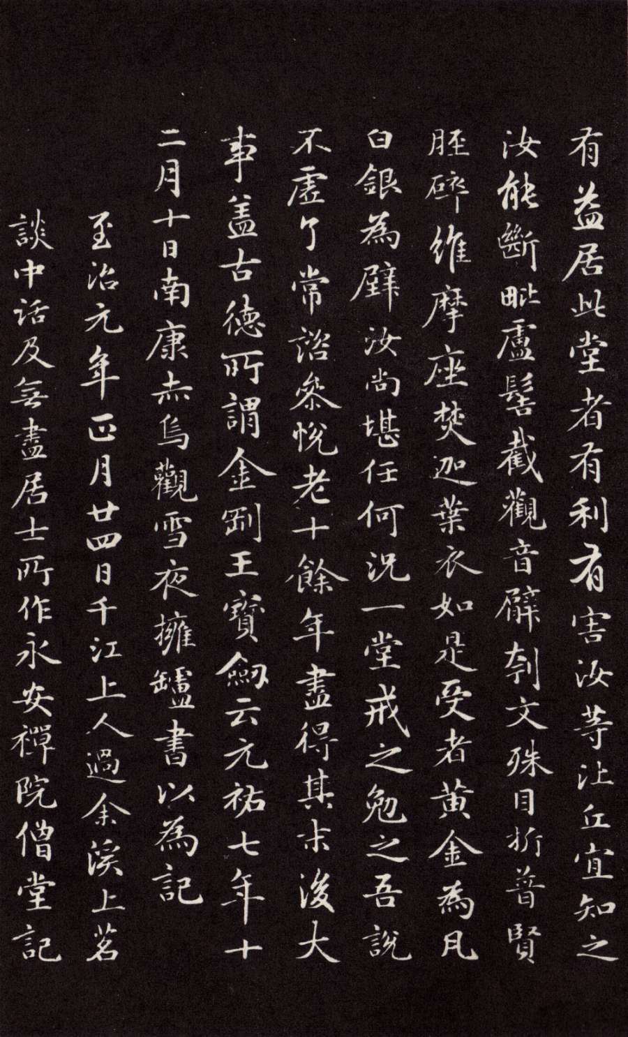 書法欣賞魏晉書法唐朝書法宋朝書法元朝書法明朝書法清朝書法近現代書法字典網>> 歷代書法>> 遼金元>> 趙孟頫行楷《撫州永安院僧堂記》(3)正文 趙孟頫行楷《撫州永安院僧堂記》(3)作者:趙孟頫 書體:行楷 首 頁 上一頁 1 2 3 趙孟頫的相關書法作品:趙孟頫《靈隱大川濟禪師塔銘》墨跡本 趙孟頫行書《陋室銘》 趙孟頫行書《酒德頌》 趙孟頫《蘭亭序十三跋》殘本 趙孟頫行書《文賦》 趙孟頫行書《洛神賦》 趙孟頫《般若波羅蜜多心經》 趙孟頫·跋趙佶《竹禽圖》 趙孟頫《太平興國禪寺碑》 相關文章:秦觀行書《摩詰輞川圖跋》 (行書)秦觀,字少游,一字太虛,號淮海居士,揚州高郵(今屬江蘇)人。 元豐年間進士。曾任...譚延闓行書《勳勞議論七言聯》 (行書)譚延闓《勳勞議論七言聯》描畫蠟箋本行書 166.2×40.9cm×2 台北故...張瑞圖行書《赤壁懷古大江東去》 (行書)張瑞圖《赤壁懷古大江東去》書畫合卷 綾本 27.9×320厘米 崇禎二年(16...周亮工《七言絕句軸》 (·行書)周亮工《行書七言絕句軸》,紙本。南京博物院藏。曾國藩楷書《竹遊記》 (楷書)曾國藩是與同代包世臣、何紹基齊名的大書家。曾一生勤勉於書法創作,走過了一條由泛而...石濤行書《贈哲翁詩卷》 (行書)石濤《贈哲翁詩卷》紙本行書 29×270cm 無錫市博物館藏 ...胡儼《題洪崖山房圖》 (行書)【釋文】憶著洪崖三十年,青青山色故依然。當時洞口逢張氳,何處人間有傅顛。陰瀑倚風...康有為《行書題蓮池書院立軸》 (行書)康有為《行書題蓮池書院立軸》 紙本行書 139.5cm×73.5cm 山東博物...沈尹默楷書《禁經永字八法》 (楷書)沈尹默楷書《禁經永字八法》釋文古人用筆之術,多於永字取法,以其八法之勢,能通一切...謝安《中郎帖》 (行書)【釋文】八月五日告淵、朗、廓、攸、靖、玄、允等。何圖酷禍暴集,中郎奄至逝沒。哀痛...