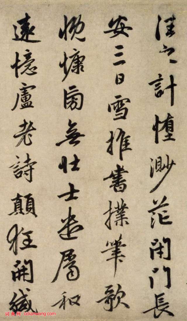 書法欣賞魏晉書法唐朝書法宋朝書法元朝書法明朝書法清朝書法近現代書法字典網>> 歷代書法>> 遼金元>> 趙孟頫行書《昔尋李願詩卷》(2)正文 趙孟頫行書《昔尋李願詩卷》(2)作者:趙孟頫 書體:行書 首 頁 上一頁 1 2 3 下一頁 尾 頁趙孟頫的相關書法作品:趙孟頫行書《千字文》 趙孟頫·跋王羲之《時雪快晴帖》 趙孟頫《雪岩和尚拄杖歌卷》 趙孟頫《靈隱大川濟禪師塔銘》拓本 趙孟頫行書《洛神賦》 趙孟頫兩版臨作《蘭亭序》 趙孟頫《太平興國禪寺碑》 趙孟頫行書《望江南淨土詞十二首》 趙孟頫行書《致景亮書冊》 相關文章:鄧石如篆書《白氏草堂記六屏》 (篆書)鄧石如篆書白氏草堂記六屏,此屏高近二百厘米,現藏於日本。鄧石如篆、隸、楷、行、草...張駿·行書手札 (行書)張駿《手札》,北京故宮博物院藏。刊於《中國書法》雜誌1991年第一期(贈頁)。王獻之《鴨頭丸帖》 (行草)【釋文】鴨頭丸,故不佳。明當必集,當與君相見。 鴨頭丸帖,行草,摹本。王獻之書。...趙孟頫楷書《杭州福神觀記》 (楷書)趙孟頫楷書書法《杭州福神觀記卷》,紙本,縱34.2cm,橫797.8cm,北京故...曾熙行書《論書畫軸》 (行書)曾熙《行書論書畫軸》紙本行書 145×47cm 1924年作釋文:思翁論書畫雲...楊峴《行書鐵味詩道六言聯》 (行書)楊峴《行書鐵味詩道六言聯》紙本行書 108.6×23.3cm×2 浙江省博物...因為愛情,趙孟頫寫下這篇《洛神賦》 (行楷)趙孟頫一生,寫過多篇《洛神賦》。1297年,他44歲時,為學生張淵書《洛神賦》;...吳琚·行書蔡襄七言絕句 (行書)【釋文】橋畔垂楊下碧溪,君家元在北橋西。來時不似人間世,日暖花香山鳥啼。吳琚《七...索靖·月儀帖 (章草)《月儀帖》傳為西晉書法家索靖所書,是章草名帖。《月儀帖》以十二月令制為尺牘,故稱...孫星衍《篆書軸》 (篆書)孫星衍《篆書軸》紙本篆書 163.4×60.4cm 北京故宮博物院藏釋文:聖人...