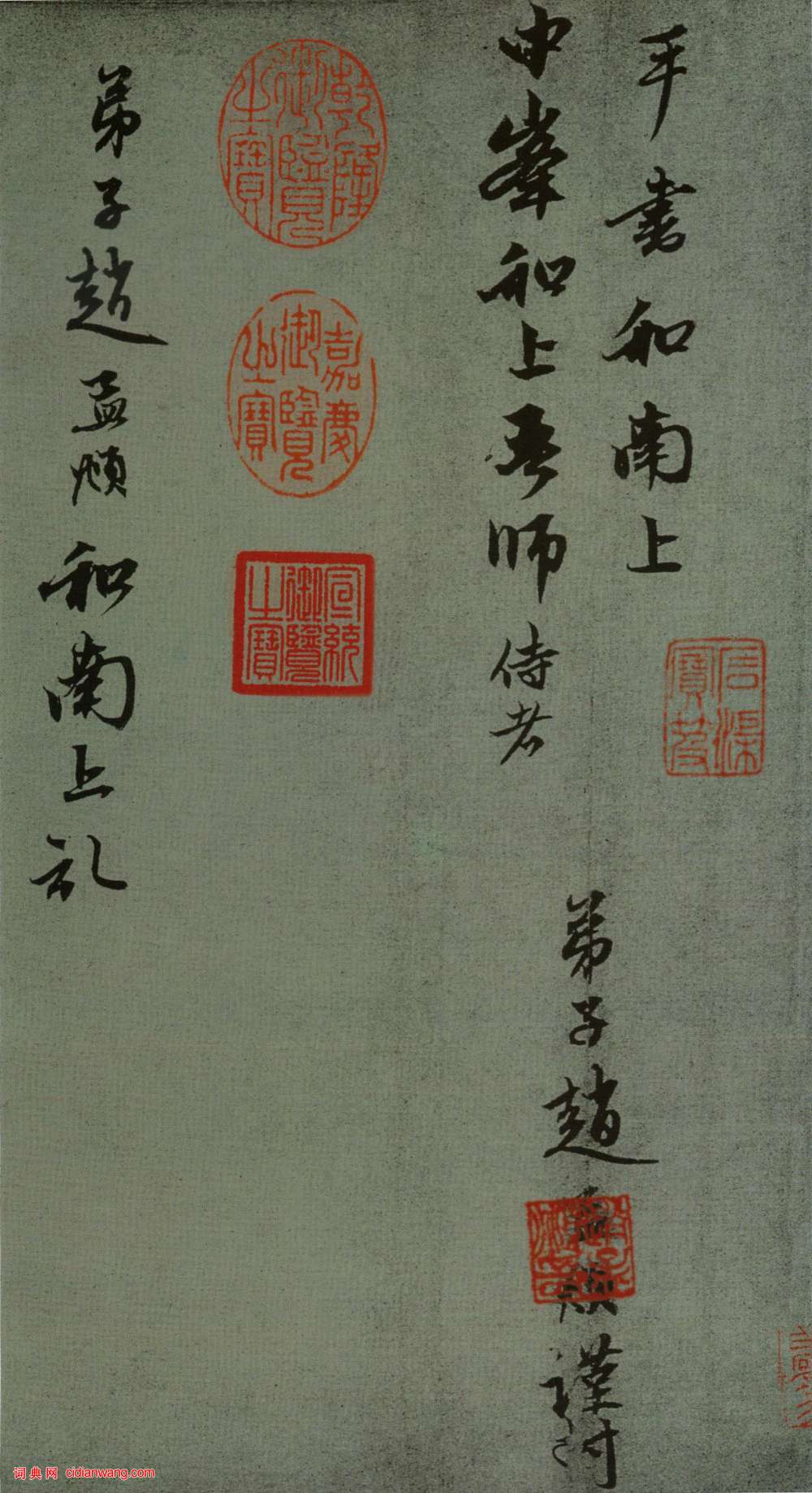 此帖書於延祐五年,其時,趙氏已六十有五。中峰和尚,浙江錢塘人,俗姓孫。他早年出家,後主天目山中峰獅子院,稱中峰和尚,與趙氏交往密切。據編者所知,趙氏寫給中峰和尚的書札,有近二十札留存於世。