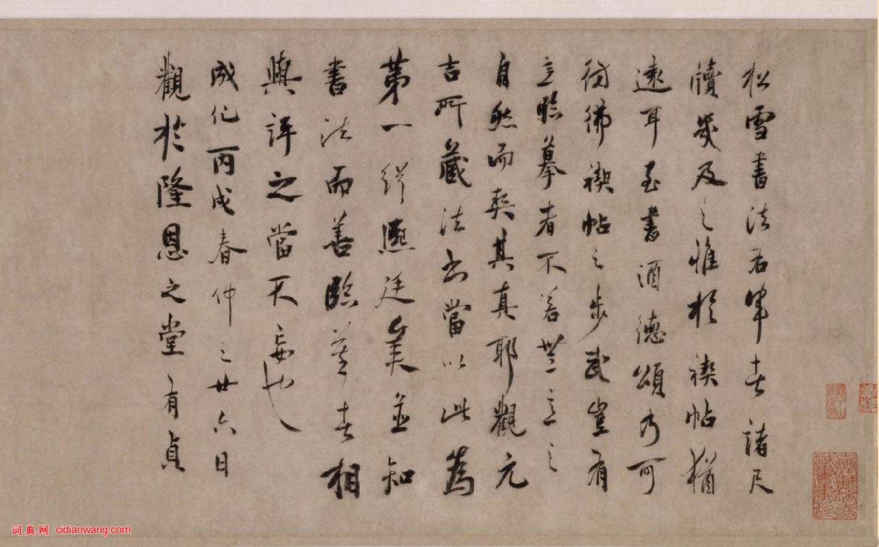 資源下載魏晉書法唐朝書法宋朝書法元朝書法明朝書法清朝書法近現代書法字典網>> 歷代書法>> 遼金元>> 趙孟頫行書《酒德頌》(3)正文 趙孟頫行書《酒德頌》(3)作者:趙孟頫 書體:行書 首 頁 上一頁 1 2 3趙孟頫的相關書法作品:趙孟頫《趵突泉詩》 趙孟頫的手札欣賞 趙孟頫《閒居賦》 趙孟頫 《近來吳門帖》 趙孟頫《靈隱大川濟禪師塔銘》拓本 趙孟頫《行草陶淵明五言詩頁》 趙孟頫行書《題陸柬之文賦卷》 趙孟頫·心經冊頁 趙孟頫行草《寄題杜尊師白雲庵瓊秀亭》二首 相關文章:顏真卿《祭侄文稿》 (行草)《祭侄文稿》是唐代書法家顏真卿追祭從侄顏季明的草稿。行書紙本,縱20.8厘米,橫...康有為《行書側身獨立七言聯》 (行書)康有為《行書側身獨立七言聯》紙本行書 150×39cm×2 浙江省博物館藏 ...吳寬楷書《韓夫人墓志銘》 (楷書)吳寬《韓夫人墓志銘》冊 紙本楷書,27.×28.9cm 北京故宮博物院藏署款:...楊法《篆書五言聯》 (篆書)楊法《篆書五言聯》 設色紙本 116×28cm×2【釋文】松竹生虛白,高雲供...白蕉《書法十講》 第九講 書髓 (不詳)第九講 書髓 我經過相當時間的推敲和思考,決定用“書髓”二字來包舉本講。因為在這...應均《四體書阮元句四條屏》 (四體)應均《四體書阮元句四條屏》 1937年 浙江永康萬泰美術館釋文: 浙東天一閣所藏...趙孟頫行書跋《韓滉五牛圖卷》 (行書)元代趙孟頫行書題跋《韓滉五牛圖卷》,北京故宮博物院藏。釋文:余南北宦遊。於好事家...吳昌碩《篆書臨散氏盤銘軸》 (篆書)吳昌碩《篆書臨散氏盤銘軸》紙本篆書 149.8×25.5cm 1922年 浙江...馮文蔚小楷臨《九成宮》 (小楷)用硬筆臨摹傳統的毛筆書法字帖,很少有合適的選擇。很多書友擅長硬筆書法,又想向歐楷...康有為行書《妸娜蓬萊橫披》 (行書)康有為《妸娜蓬萊橫披》 紙本行書 32cm×129cm釋文:妸娜蓬萊。款 識...