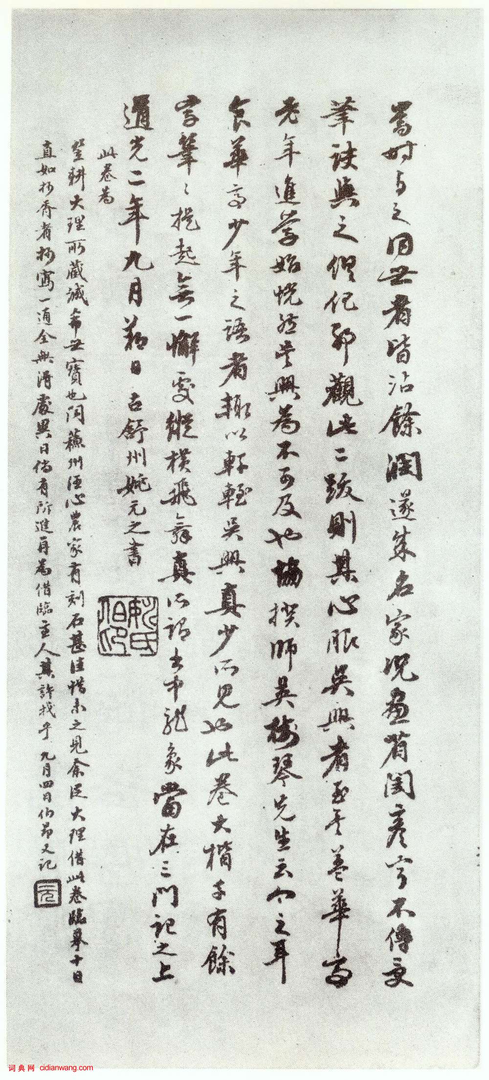 資源下載魏晉書法唐朝書法宋朝書法元朝書法明朝書法清朝書法近現代書法字典網>> 歷代書法>> 遼金元>> 趙孟頫楷書《仇鍔墓碑銘》(40)正文 趙孟頫楷書《仇鍔墓碑銘》(40)作者:趙孟頫 書體:楷書 首 頁 上一頁 31 32 33 34 35 36 37 38 39 40趙孟頫的相關書法作品:趙孟頫行書臨褚遂良《枯樹賦》 趙孟頫《般若波羅蜜多心經》 趙孟頫行書《洛神賦》 趙孟頫臨《定武蘭亭序》 趙孟頫楷書《膽巴碑》 趙孟頫行草《致中峰和尚札》冊 趙孟頫·跋蘇軾《治平帖》 趙孟頫行書《惠書帖》 趙孟頫行書《宗陽宮帖》 相關文章:全國第一屆書法篆刻展覽-篆書部分1980年5月,全國第一屆書法篆刻展覽(國展)在瀋陽展出,現與大家分享由人民美術...張瑞圖行草《蘇軾無言亭》 (行草)張瑞圖《行草蘇軾無言亭》詩軸 綾本 193.2×46.5厘米 年代不詳 南京博...倪元璐《行草書題小桃源圖詩軸》 (行草)倪元璐《行草書題小桃源圖詩軸》 絹本行草書,133.7×41.9cm。北京故宮...蔡襄《持書帖》 (行楷)蔡襄《持書帖》,紙本,行楷,縱27.2厘米,橫57.4厘米,故宮博物院藏。此帖是...李文田《致雨生書札》 (行書)李文田《致雨生書札》。釋文:雨生尊兄大人執事:八月二日接奉手誨,敬悉諸凡,遙瞻矞...石蘊玉行書《顛倒蘭亭序》 (行書)《顛倒蘭亭序》墨跡本 紹興蘭亭,那是碑刻書法薈萃的地方。在眾多萬人傳誦的碑刻...吳熙載《篆書茗杯書卷五言聯》 (篆書)吳熙載《篆書茗杯書卷五言聯》 紙本, 蘭千山館藏釋文:茗杯眠起味,書卷靜中緣。轉...林則徐小楷臨《蘭亭序》 (小楷)林則徐的書法在27歲中進士入翰林院時已名聲卓著,作為清代著名書法家,他的書法宗唐...顏真卿66歲時小楷《乾祿字書》北宋歐陽修的《集古錄》著錄了《乾祿字書》拓本。其中講到兩本,一是魯公所書真本,二...鮮于樞《行草詩讚卷》 (行草)鮮于樞《行草詩讚卷》縱43.4厘米 橫876.4厘米 上海博物館藏鮮于樞《行草詩...