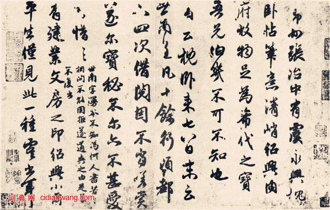 常州張治中有虞永興《枕臥帖》,筆意清峭,紹興內府故物,足為希代之寶,吾兄伯幾不可不知也。首雲“枕臥來七八日”,末雲“世南呈”,凡十餘行。頃都下四次借閱,因不肖嗟賞,遂爾寶秘,不爾,亦不甚愛,可惜可惜。(世南字漫,本不知為何人書,苦苦相問,不能固拒,遂道與之,由是遂不復出)有建業文房之印,紹興小璽。平生僅見此一種虞書耳。