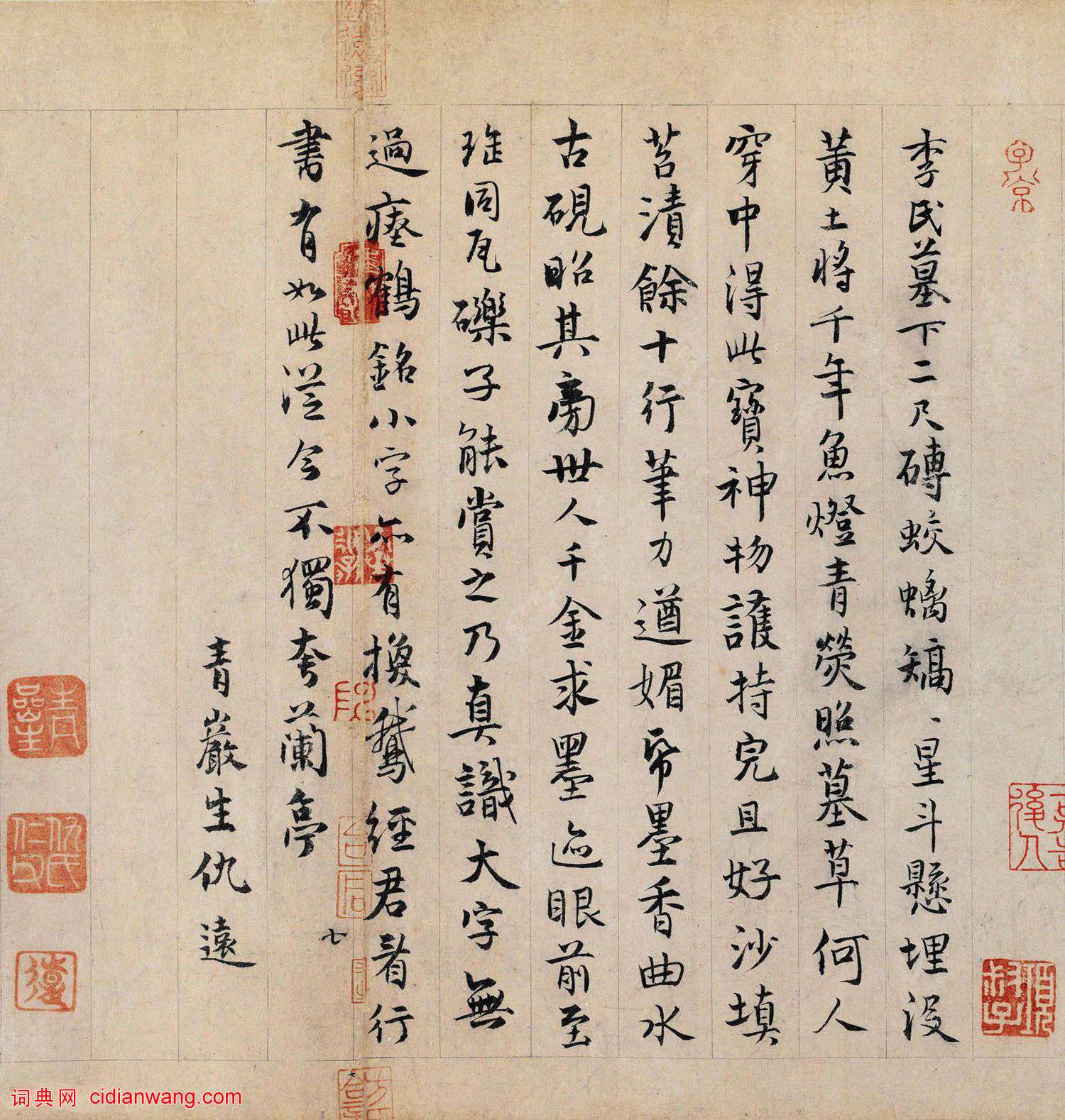 李氏墓下二尺磚,蛟螭矯矯星斗懸,埋沒黃土將千年,魚燈青熒照墓草,何人穿中得此寶,神物護持完且好。沙填苔漬餘十行,筆力遒媚紙墨香,曲水古硯昭其旁,世人千金求墨跡,眼前至缶同瓦礫,子能賞之乃真識,大字無過《瘞鶴銘》,小字亦有《換鵝經》,君看行書有如此,從今不獨夸《蘭亭》。