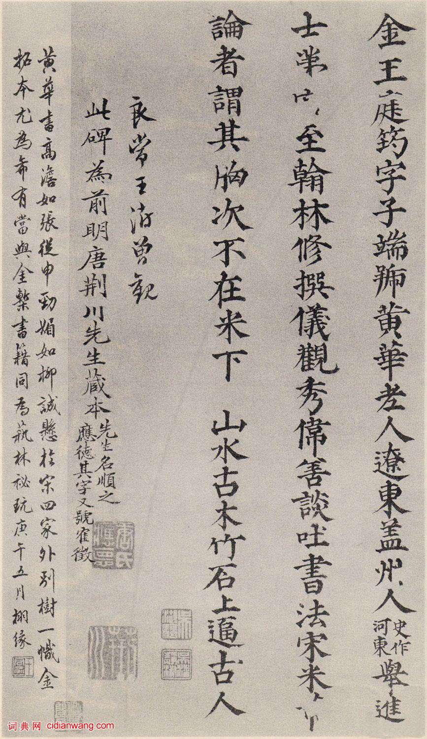 王庭筠石刻字跡傳世不多,《重修蜀先主廟碑》是其晚年手筆。通篇行楷,沉著雄健,別具一格。此拓本傳世不多。這個金拓本,墨色古舊,字口清晰,是珍貴的。原為吳湖帆四歐堂所藏,現藏於上海博物館。