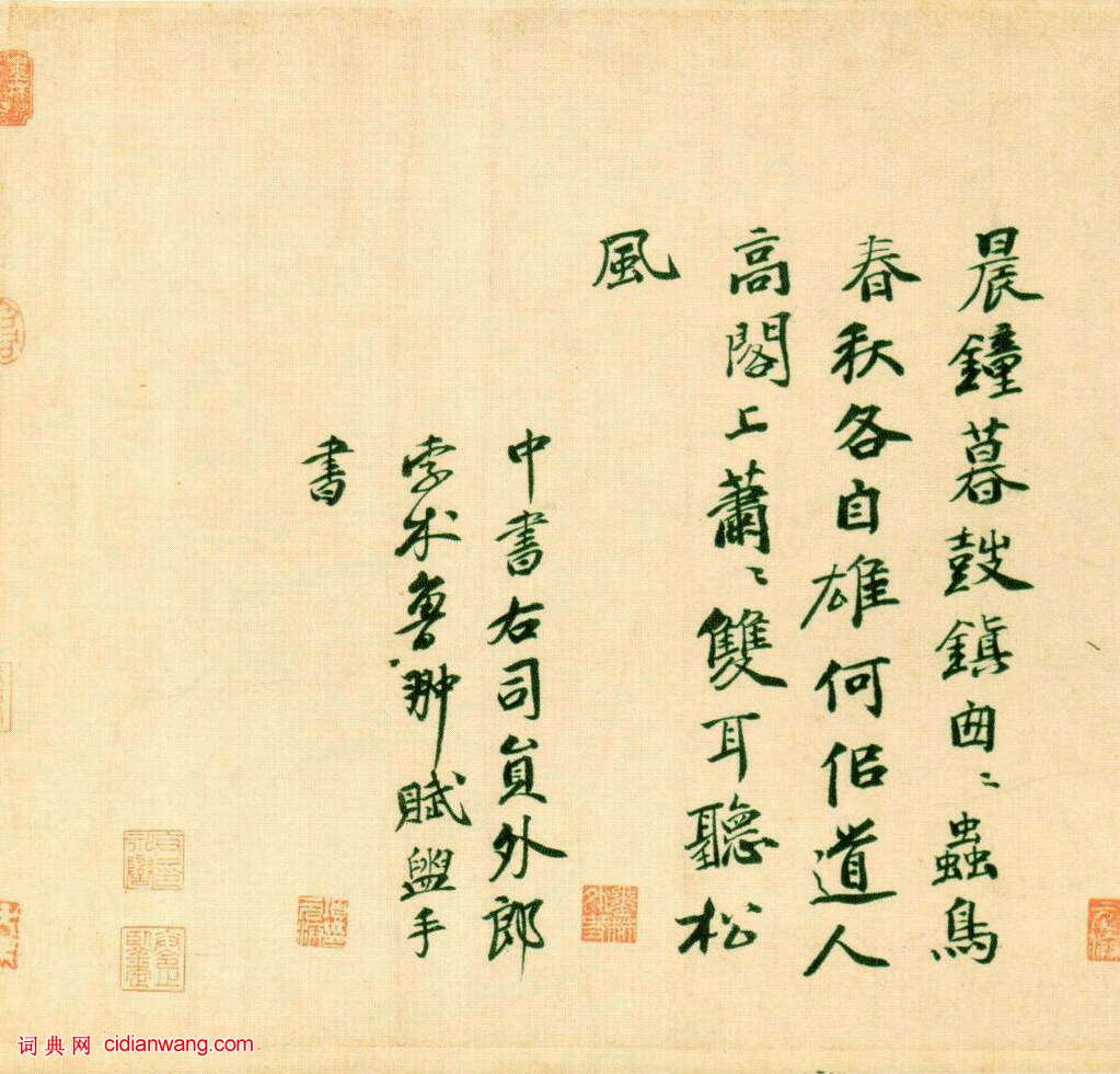 晨鐘暮鼓頌曲曲, 蟲鳥春秋各自雄。 何侶道人高閣上, 瀟瀟雙耳聽松風。