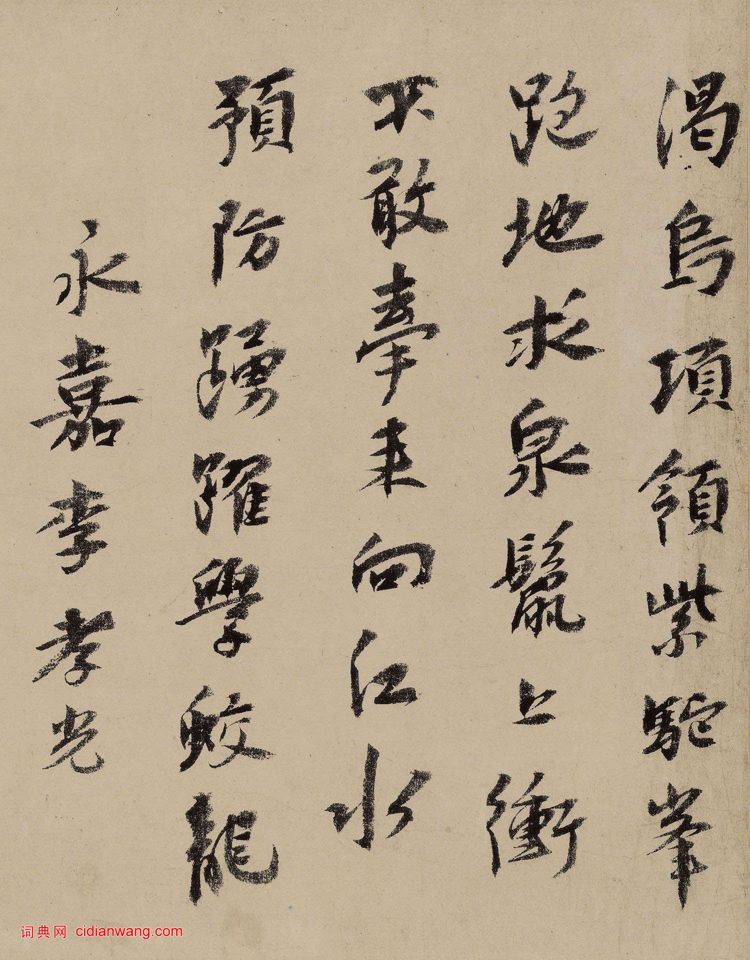 書法欣賞魏晉書法唐朝書法宋朝書法元朝書法明朝書法清朝書法近現代書法字典網>> 歷代書法>> 遼金元>> 李孝光跋趙孟頫《飲馬圖》正文 李孝光跋趙孟頫《飲馬圖》作者:李孝光 書體:行書 李孝光跋趙孟頫《飲馬圖》,行書,紙本,遼寧省博物館藏釋文:渴烏項領紫駝峰,跑地求泉鬣上沖。 不敢牽來向江水,預防踴躍學蛟龍。永嘉李孝光2018-1-24 9:52:07 李孝光的相關書法作品:李孝光行書《發建業帖》 李孝光跋趙孟頫《飲馬圖》 相關文章:書法精論九十條1、眼高者手高,眼低者手低。2、作字先作人,人奇字自古。技巧是血肉,觀念是靈魂。...鮮于樞草書《杜甫魏將軍歌詩》 (草書)鮮于樞《草書杜甫魏將軍歌詩》紙本 行草書 縱48厘米 橫462厘米,北京故宮...顏真卿楷書《大唐中興頌》 (楷書)《大唐中興頌》,唐元結撰,顏真卿書,唐摩崖刻石,宋拓,麻紙,黑墨精拓,裝裱成冊,...包世臣行書《致熙載札》 (行書)包世臣《致熙載札》紙本行書 23×13cm×2 日本私人藏【資料來源】《中國...席夔隸書《千字文》 (隸書)席夔,清代書畫家。字子研,四川彭縣人。官廣西知州。工畫花卉竹石,極生動有法度。傳...吳熙載篆書《張華勵志詩四屏》軸 (篆書)吳熙載《張華勵志詩四屏》軸 紙本,118.2×37.5cm×4 日本東京國...包世臣《行書玉笈瓦當八言聯》 (行書)包世臣《行書玉笈瓦當八言聯》灑金箋本行書 152×28.5cm×2 西泠印社...蘇軾楷書《醉翁亭記》 (楷書)《醉翁亭記》,歐陽修撰,蘇軾書。此碑刻,現存於安徽滁州醉翁亭景區寶宋齋內,兩塊四...周天球行書《錄沈佺期詩扇》 (行書)周天球《錄沈佺期詩扇》行書 南京博物院藏釋文:天長地闊嶺頭分,去國離家見白雲。洛...王詵行書跋王齊翰《勘書圖》 (行書)王詵跋王齊翰《勘書圖》(又名挑耳圖) 南京大學圖書館藏。 王齊翰《勘書圖》...