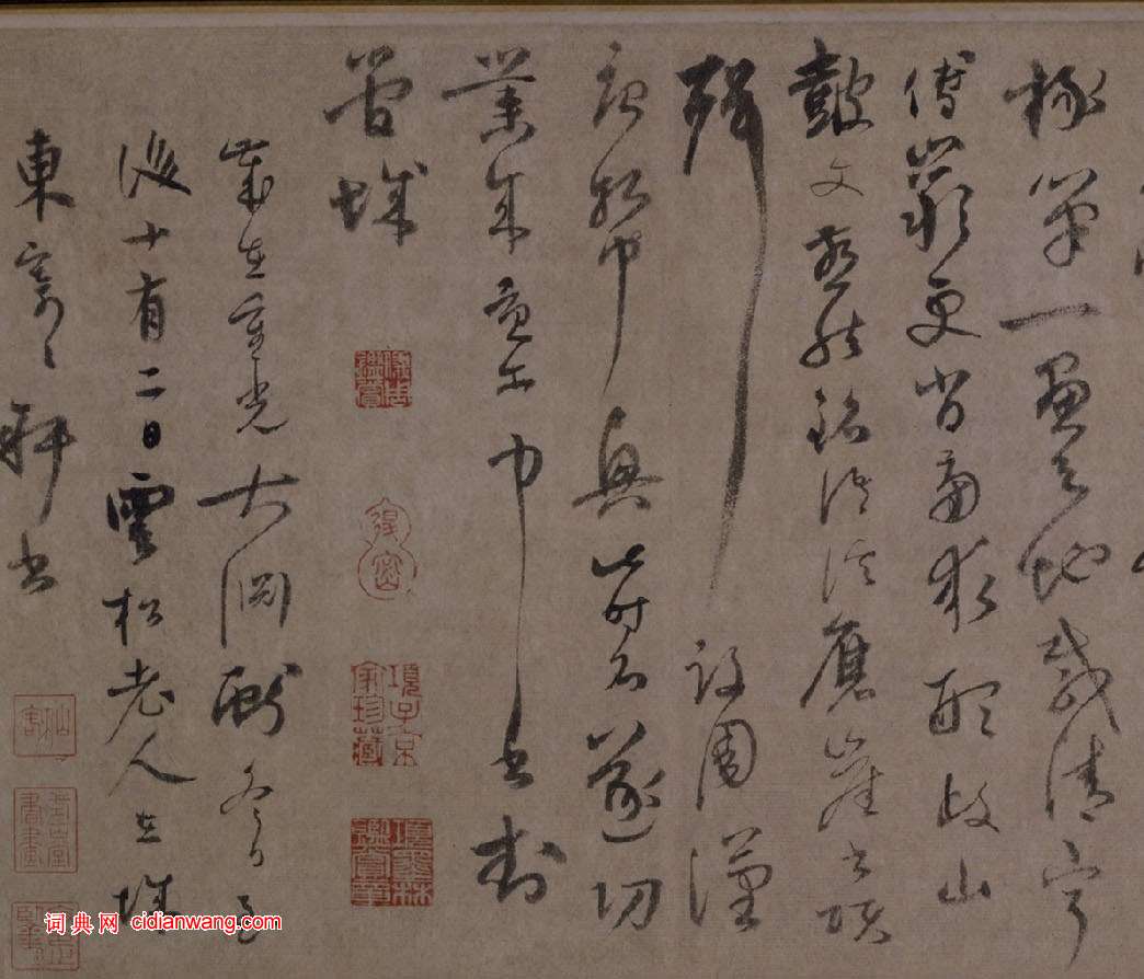 苕溪之水天目來,月華倒浸瓊瑤台。士龍雲孫住溪穴,生禽玉兔出明月。玉兔秋毫勁於鐵,崑崙嶰竹昆刀截。束毫管竹齊且尖,脫穎不數毛錐銛。來供雲窗才一執,逸興橫生風雨意。波濤洶湧滄海立,驅毫入波飲玄湆。山澤龍蛇曾敢蟄,飛走雲菸鬼神泣。科斗久廢篆籀構,撥橙匾何盤紆。躍龍臥虎便且舒,鐘王草聖人爭趣。眵瞳晚年方著書,心畫每愛隺骨臞。良林遒健鐵不如,眾材翕茸來墨豬。遂良擇材人未識,妙趣難施渾綿力。瑠璃象管徒爾飾,到手胡能供一擲。苕東此藝比屋攻,幾人如俊稱良工。補天須奪造化功,何時可入明光宮。麒麟涓涓瀉寒淥,目光隱現流鸜鵒。洴藤澼繭三百幅,一拂春膏淨於玉。辭宏氣壯意神速,頃刻珠璣千萬斛。浩然文思河東傾,傭書恥作細若蠅。會縛虎鬚作椽筆,一畫天地鹹清寧。傳岩更肖旁求行,歧山皷文燕然銘。浯溪摩崖書頌聲,殷周漢唐相中興。此時名遂功業成,貢爾中書封管城。歲在重光大淵獻冬日至後十有二日,雲松老人在城東寄寄軒書。卷前鈐陸氏“雲間”、“幽谷一叟”印2方;卷末鈐陸氏 “宅山”、“陸氏居仁”、“靜壽山”、“臥松亭”、“寄寄軒”款印5方。鑑藏印以項元汴、卞永譽、安岐三家最多,並有項氏“意字號”編號。