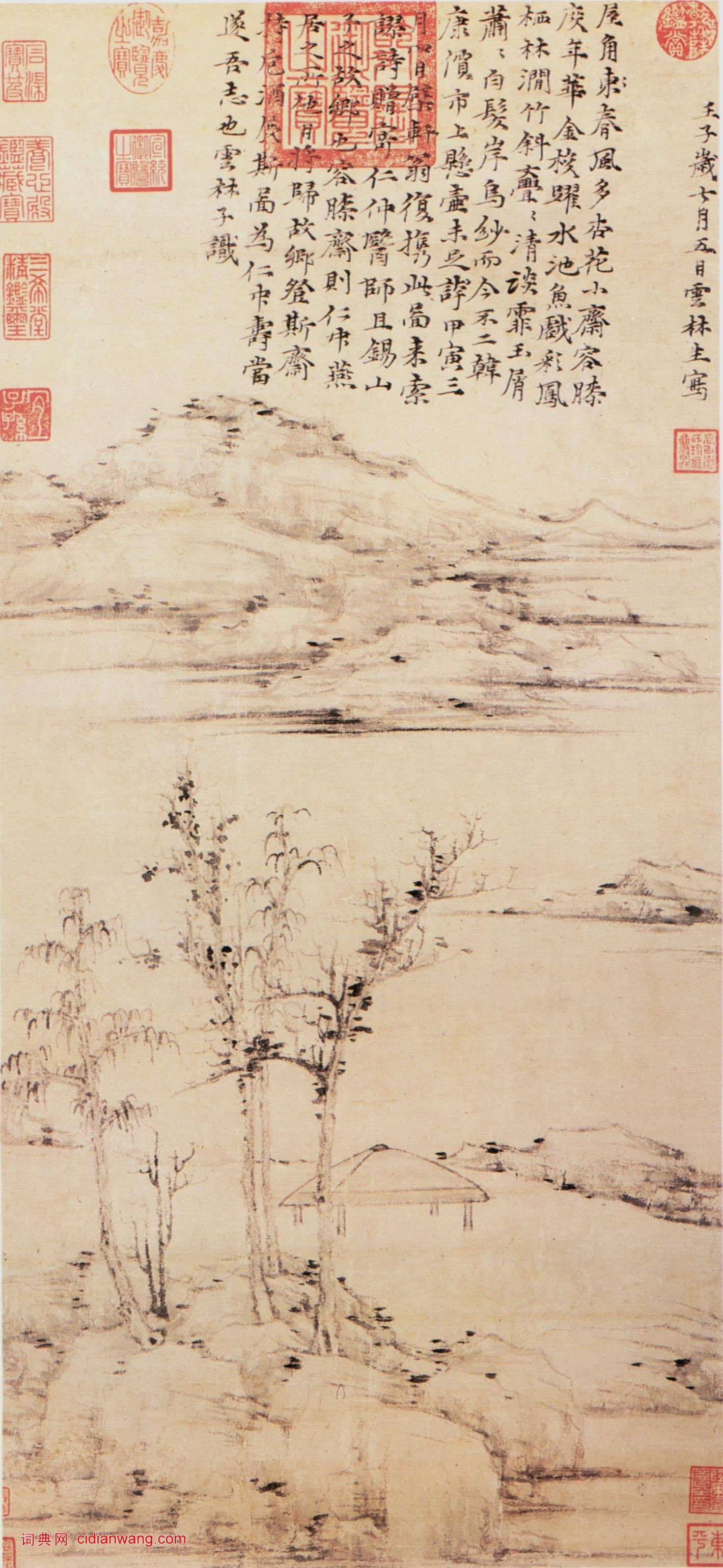倪瓚《容膝齋圖》 立軸 1372年 紙本 縱74.2厘米 橫35.4厘米 台北故宮博物院藏