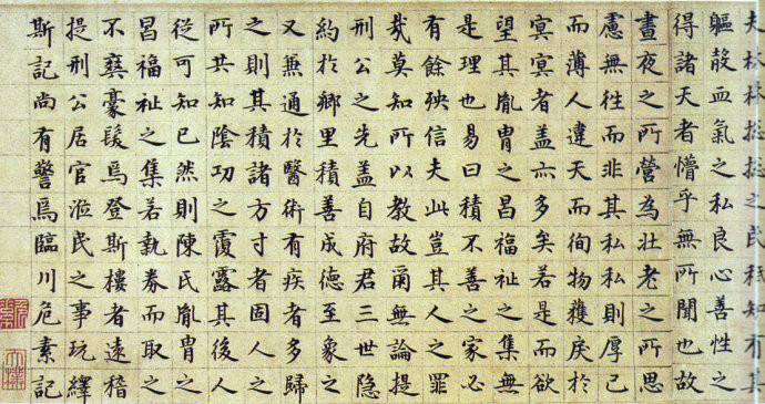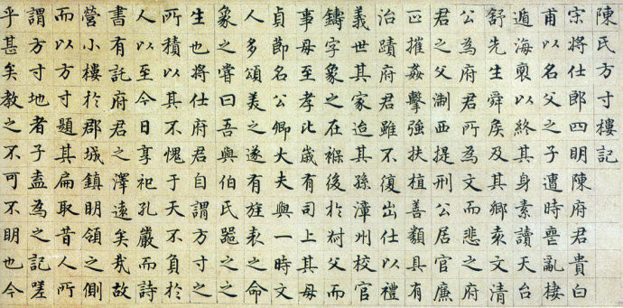 晚元的危素,是江西臨川人。他的《陳氏方寸樓記楷書卷》,是一幅精謹、工整的作品。《書史會要》稱:“危素善楷書,有釋智永、虞永興典則。”用筆骨力遒健,結字端莊秀俊,全篇在有界格的紙上展開,行距、字距都切割成勻等的空間,儘管如此,他仍能從結字的技巧中求得一些變化。很難挑出用筆上的毛病,但也很難找到他個性的東西。危素為官小心翼翼,清白廉潔,恪守朝綱。這種個性反映在筆墨上便是法度的嚴謹、個性的不足。
