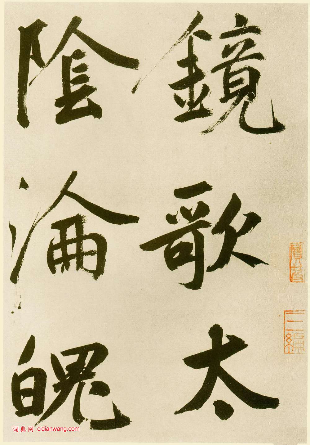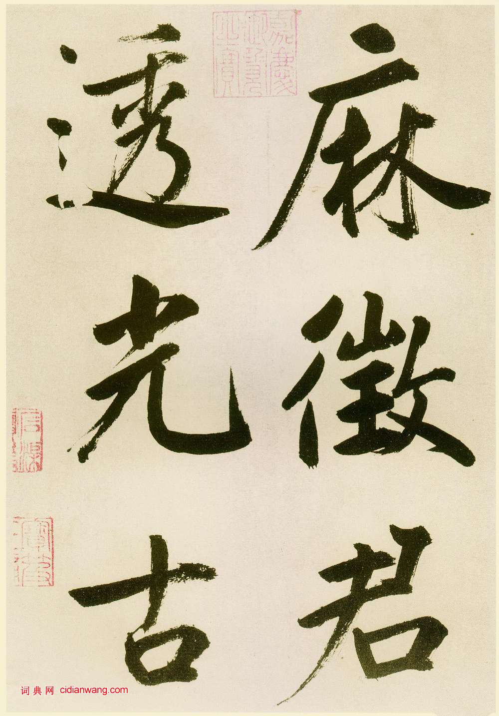他似乎不經意於每一筆畫的精美,而著力於每個字的整體氣勢與形象的創造。蘇軾曾說過:“大字難於結密而無間,小字難於寬綽而有餘。”此幅大字稱得上“結密無間”,而且越往後寫的越好,運筆著墨均達到完美的程度。總體看,此幅大字型勢規整,氣勢恢弘,是鮮于氏大楷書的典型之作。