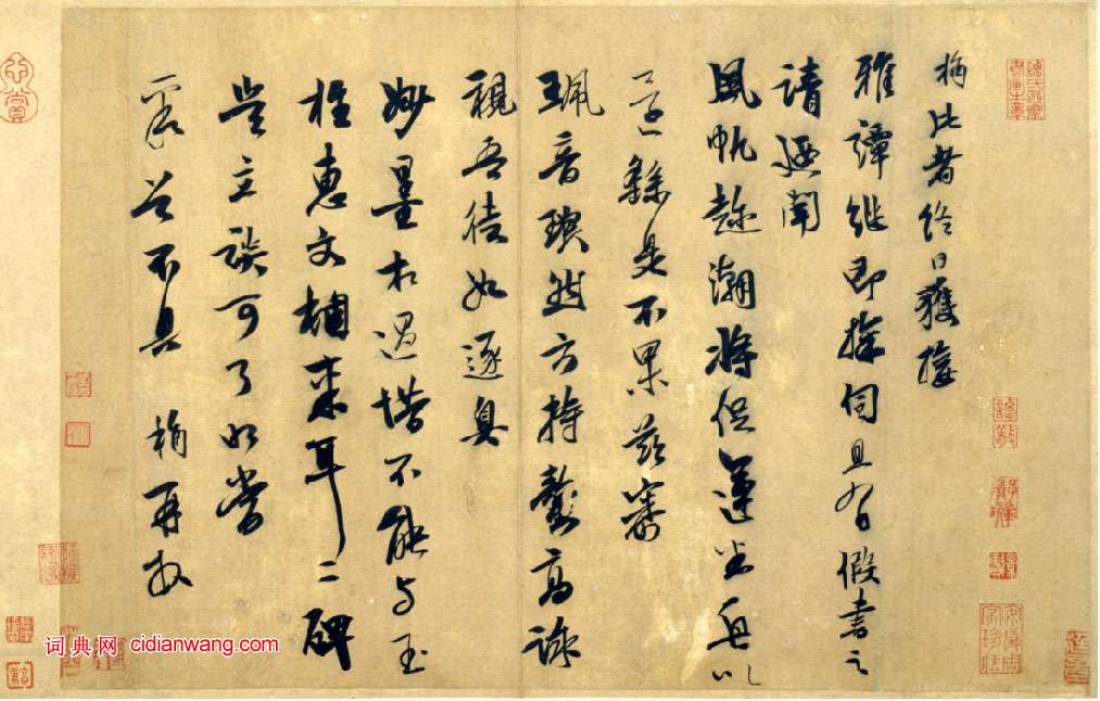 此帖為應酬信札,故信筆書寫,無拘無束,章法自然得體,用筆結字頗有法度,提按轉折,刻意精緻,具有米芾沉著痛快,欹側奇險之筆勢。