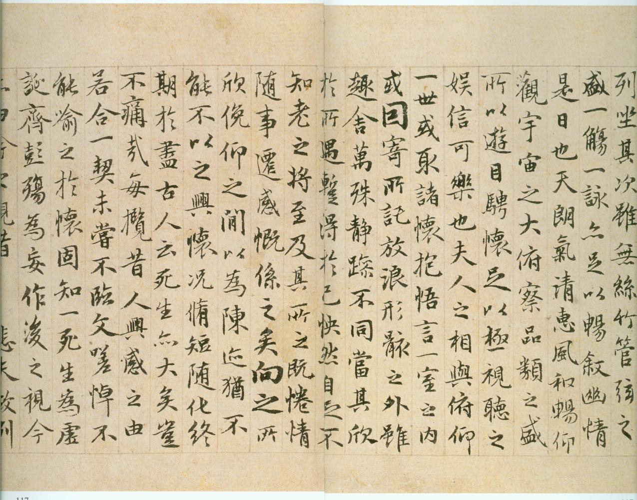 《蘭亭序》共三百二十七字,中間有二十個“之”字,七個“不”字。其他如“感”、“懷”、“暢”、“會”等,都有重出重現,但是他的寫法卻個個不同。筆畫多的字,變化尚容易些。而“之”、“不”二字,每字不過三四筆,細加分析,或從結構上變化,或從筆法上轉換,總讓人感到不同之處。既出奇制勝,又不離奇古怪。