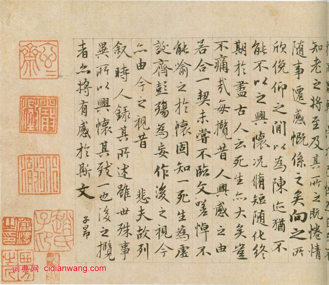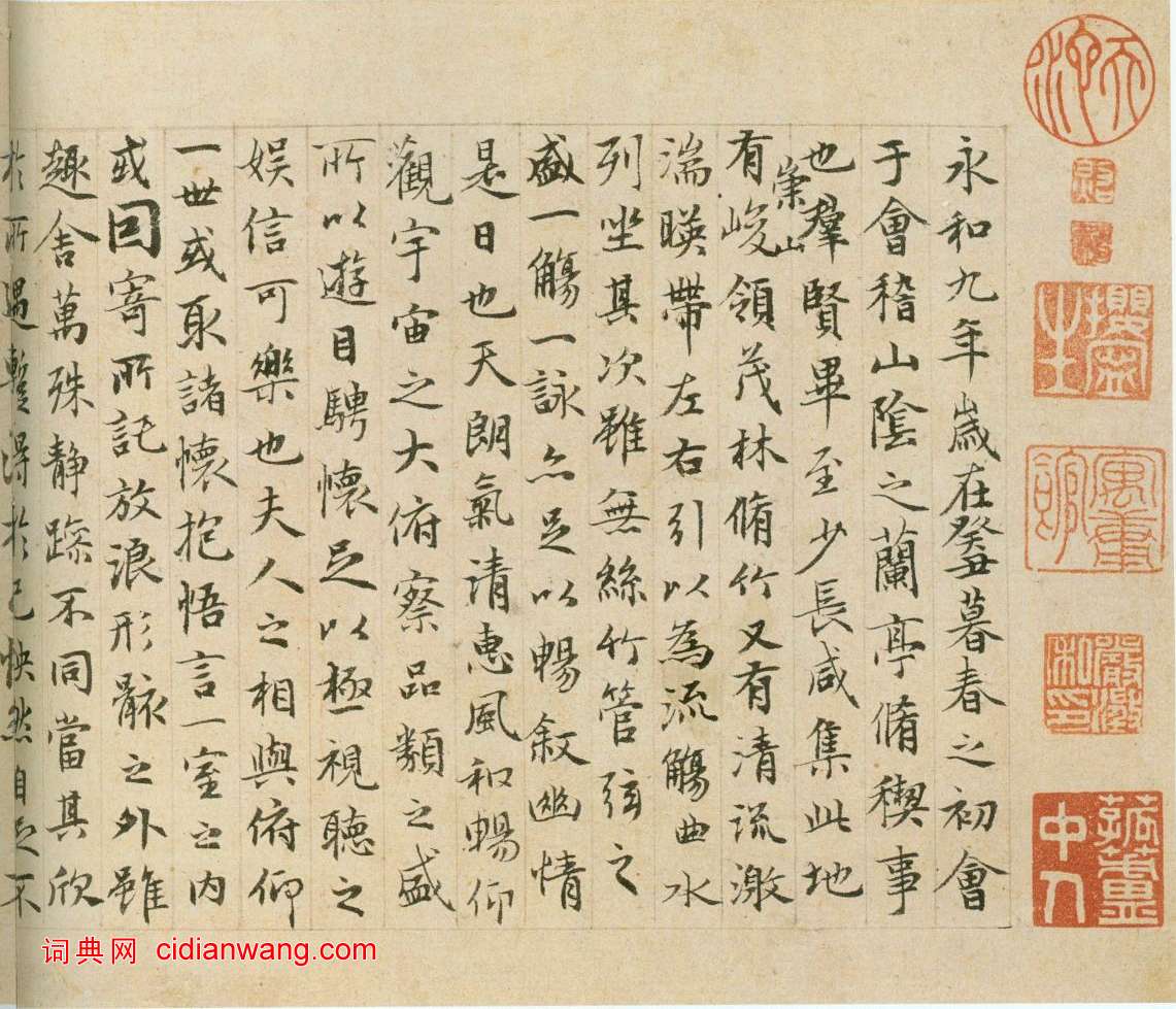 趙孟頫的臨本,可謂遙接書聖傳脈,全貼一筆不苟,頗有天然之趣,雖從規矩中來,卻無一毫窘束之意,使人想見神仙蛻骨的風度。米芾有詩詠蘭亭曰:“之字最高無一似”,試看趙氏臨本中的“之”字,或舒展、或緊密、或出峰、或藏鋒、或秀朗、或古拙,變化多而又渾然一體。《蘭亭帖》中的一些細節,再趙的筆下屢有令人擊節的再現,如“左”字,上面一橫接著向左一挑,接處提筆向上連筆翻轉,在定武蘭亭中不甚顯豁,趙孟頫特意強調寫出,留給後人無窮方便。蘭亭貼中一些不常見的點劃,如反捺等,趙都寫得十分精密,十分到位。