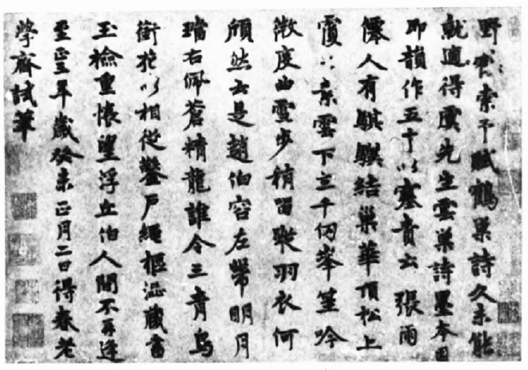 書法欣賞魏晉書法唐朝書法宋朝書法元朝書法明朝書法清朝書法近現代書法字典網>> 歷代書法>> 遼金元>> 張雨行書《鶴巢詩卷》正文 張雨行書《鶴巢詩卷》作者:張雨 書體:行書 至正三年(1343) 張雨《鶴巢詩卷》紙本蘇州博物館藏 資料來源:《中國書法全集》第45卷(榮寶齋) 2018-4-9 10:58:49 張雨的相關書法作品:張雨行書《致方鳳札》 張雨《賦聽泉亭詩札》 張雨·跋《褚摹蘭亭序》 張雨·發蛻庵詩札 張雨行書《登高詩札》 張雨行書《上閒止詩卷》 張雨·澱湖社集尺牘 張雨《寄彝齋、雲林諸公五言詩札》 張雨行書《登南峰絕頂七言律詩軸》 相關文章:王守仁草書《回軍上杭詩》 (草書)王守仁《回軍上杭詩》軸 紙本 行草書 138.5×69cm 正德十二年(151...于右任草書《唐可朋詩耕田鼓四屏》 (草書)于右任草書《唐可朋詩耕田鼓四屏》,來自《中國書法》雜誌 釋文...智永《真草千字文》 (真草)《真草千字文》,真草二體,是智永傳世代表作,也是我國書法史上的留傳千古名跡。傳智...吳熙載行書《節臨顏真卿爭坐位帖扇面》 (行書)吳熙載《節臨顏真卿爭坐位帖扇面》紙本行書 18.1×53cm 北京故宮博物院藏...金琮·秋日山中寫懷詩 (行書)金琮《秋日山中寫懷詩》,行書。王寵·小楷臨黃庭經 (小楷)王寵臨《黃庭經》,小楷。本冊所載王寵臨王羲之小楷諸帖點畫清腴圓渾,結字寬綽疏宕,...李鱓《行書五言聯》 (行書)釋文:歸愚識夷塗,汲古得修綆李鱓,中國清代著名畫家,字宗揚,號復堂,別號懊道人、...趙構行楷《賜岳飛手敕》 (行楷)趙構《賜岳飛手敕》 紙本 行楷 36.7×67.5cm 紹興七(1137)年 ...董其昌行草《羅漢贊等書卷》 (行草)董其昌《行草書羅漢贊等書卷》,又名《試筆帖》,紙本,縱31.1厘米,橫631.3...俞和小楷《臨樂毅論》 (小楷)元代俞和小楷書法臨樂毅論,24.7×68.5cm,至正二十年(1360)冬十月...