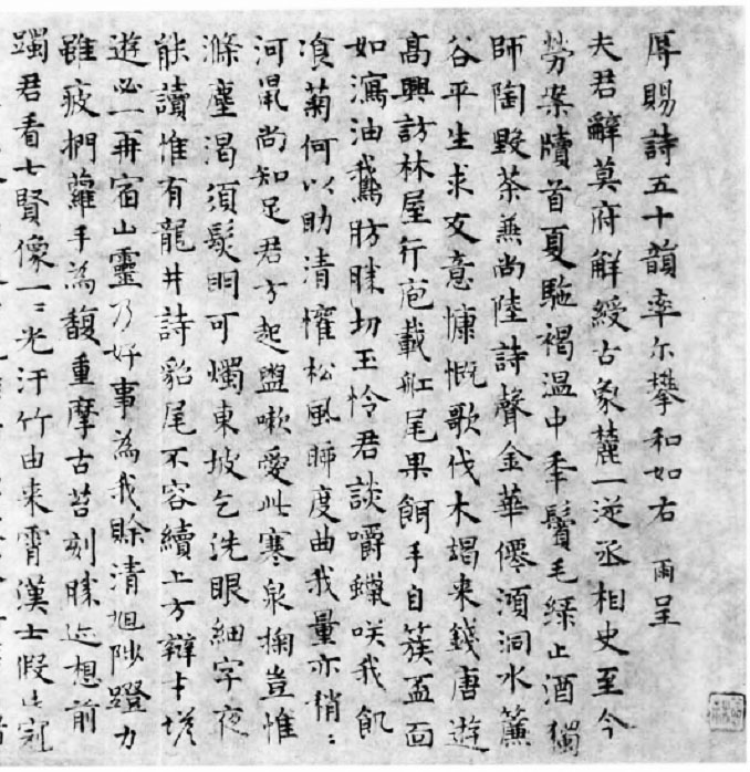 書法欣賞魏晉書法唐朝書法宋朝書法元朝書法明朝書法清朝書法近現代書法字典網>> 歷代書法>> 遼金元>> 張雨《九鎖山小楷詩卷》(2)正文 張雨《九鎖山小楷詩卷》(2)作者:張雨 書體:小楷 首 頁 上一頁 1 2 3 4 下一頁 尾 頁 全文2018-4-9 11:15:57 張雨的相關書法作品:張雨行書《上閒止詩卷》 張雨行書《次韻天鏡上人送柑詩帖》 張雨小楷《跋吳叡篆書千字文》 張雨行書《登高詩札》 張雨行書《跋褚遂良摹蘭亭序卷》 張雨《台仙閣記行書卷》 張雨《次韻閒止詩卷》 張雨行書《絕頂新秋詩軸》 張雨行書《鶴巢詩卷》 相關文章:文徵明行草《城居煩暑詞翰冊》 (行草)明代,文徵明行草書法城居煩暑詞翰冊,六頁。釋文:城居煩暑避無方,野寺覓清涼。通湖...張瑞圖草書《李白月下獨酌》 (草書)張瑞圖 草書《李白月下獨酌》 紙本 北京故宮博物院藏【釋文】花間一壺酒,獨酌無相...吳熙載《草書花底燈前七言聯》 (草書)吳熙載《草書花底燈前七言聯》 136×28cm×2 西泠印社藏釋文:花底振衣...鄭簠《隸書蘇軾跋句軸》 (隸書)鄭簠《隸書蘇軾跋句軸》紙本隸書 127×56.7cm,天津博物館藏 ...吳榮光·跋周東卿《魚樂圖》 (行書)吳榮光跋周東卿《魚樂圖》,縱30.8厘米,現藏於美國大都會美術館。落到乾隆手上,是趙孟頫的悲哀文 許念念趙孟頫簡單而尷尬,他是元庭上的一隻花瓶。展開來說他的一生似無必要,因為...王羲之《蘭亭序》 (行書)神龍本(馮承素摹本)【釋文】永和九年,歲在癸丑,暮春之初,會於會稽山陰之蘭亭,修...王羲之草書《司州供給帖》 (草書)王羲之書《司州帖》,榻本,八行,四十四字。草書,南京大學藏翁方綱宋拓本。 此帖所...張瑞圖《行書韋元旦詩》 (行書)張瑞圖《 行書韋元旦詩》軸 綾本 165×56cm 北京工藝美術博物館慶雲堂舊...蘇軾《次辯才韻詩帖》 (行書)【釋文】辯才老師,退居龍井,不復出入。軾往見之,常出至風篁嶺。左右驚曰:“遠公復...