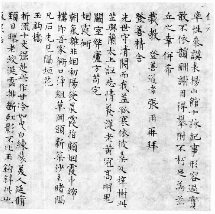 書法欣賞魏晉書法唐朝書法宋朝書法元朝書法明朝書法清朝書法近現代書法字典網>> 歷代書法>> 遼金元>> 張雨《九鎖山小楷詩卷》(4)正文 張雨《九鎖山小楷詩卷》(4)作者:張雨 書體:小楷 首 頁 上一頁 1 2 3 4 全文2018-4-9 11:15:57 張雨的相關書法作品:張雨《台仙閣記行書卷》 張雨·次韻天鏡上人送柑詩帖 張雨行書《登南峰絕頂七言律詩軸》 張雨·澱湖社集尺牘 張雨·跋《褚摹蘭亭序》 張雨行書《次韻天鏡上人送柑詩帖》 張雨行書《自書詩冊》 張雨《九鎖山小楷詩卷》 張雨·發蛻庵詩札 相關文章:黃姬水《行書讀升庵太史過射陂客部詩卷》 (行書)黃姬水《行書讀升庵太史過射陂客部詩卷》紙本行書 24.5×374.8cm 上海...倪瓚行書《呈雲浦詩札》 (行書)倪瓚《呈雲浦詩札》 香港中文大學藏釋文:四月廿日過江渚茅屋雜興四絕句,錄呈雲浦明...《敦煌曲子》殘稿 (楷書)《敦煌曲子》殘稿 法國巴黎國家圖書館藏 轉自《敦煌國際項目》IDP資料庫 敦煌曲...董其昌·題宋拓智永《真草千字文》 (行書)董其昌題宋拓智永《真草千字文》,行書。釋擔當《行草書四言詩軸》 (行草)《行草書四言詩軸》 紙本 135.2X31.3cm 南京博物院藏 ...黃道周小楷 《雜書冊》 (小楷)黃道周《雜書冊》綾本 楷書 24.5×12cm ×24 無紀年 雲南省博物館...高翔《隸書送楊已君歸金陵詩軸》 (隸書)高翔《隸書送楊已君歸金陵詩軸》 紙本隸書 94×35cm 安徽省博物館藏 【資...徐浩楷書《李峴墓誌》 (楷書)徐浩所書《李峴墓誌》在2000年出土於西安市長安區郭杜鎮,同時出土還有《李峴妻獨...鍾繇·薦季直表 (楷書)鍾繇書於魏黃初二年(221),楷書,書時鐘繇已七十高齡。此表內容為推薦舊臣關內侯...文彭《致錢榖札之二》 (草書)文彭《致錢榖札之二》 35×104cm 上海博物館藏釋文: 前承華札,極感。拜...