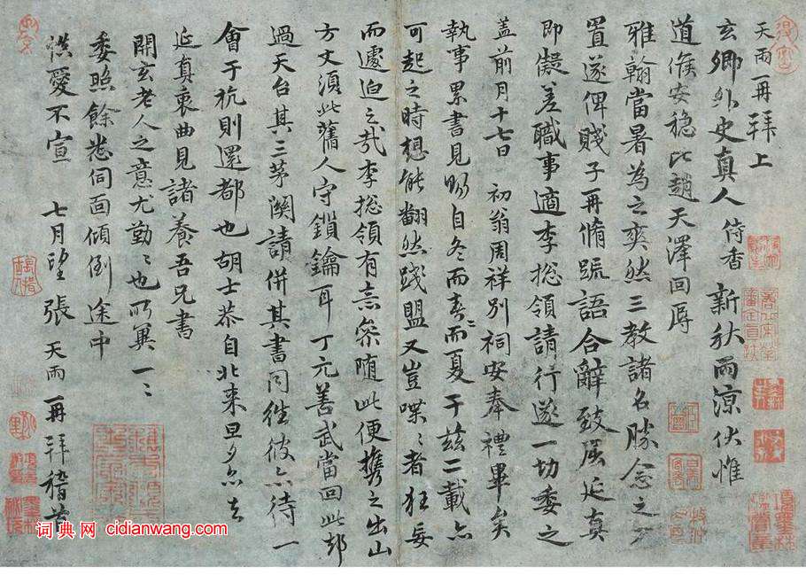 天雨再拜上,玄卿外史真人侍香。新秋雨涼,伏惟道候安穩。比趙天澤回辱雅翰,當暑為之爽然。三教諸名勝,念之不置,遂俾賤子再修疏語。合辭致屈,延真即儗差職事。適李摁領請行,遂一切委之。蓋前月十七日,初翁周祥別祠,安奉禮畢矣。執事累書見賜,自冬而春,春而夏,於茲二載,亦可起之時。想能翻然踐盟,又豈喋喋者,狂妄而遽迫之哉,李摁領有意參隨此便,攜之出山,方丈須此舊人守鎖鑰耳。丁元善武當回此,卻過天台。其三茅關,請並其書同往。彼亦待一會於杭,則還都也。胡士恭自北來,旦夕亦去。延真衷曲,見諸養吾兄書。開玄老人之意,尤勤勤也。所冀一一委照餘悉。伺面傾倒,途中慎愛不宣。