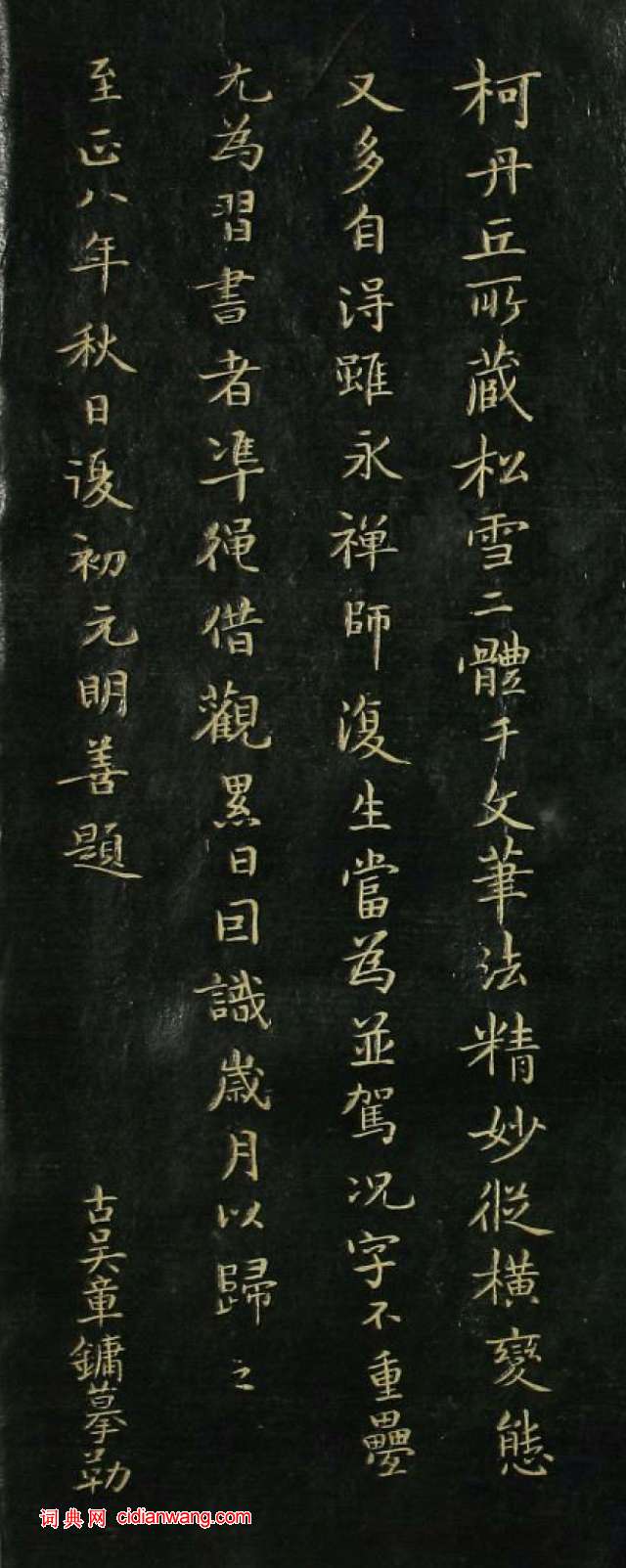 柯丹丘所藏松雪二體千文,筆法精妙,縱橫變態又多自得,雖永禪師復生當為並駕,況字不重疊,猶為習書者準繩。借觀累日,因識歲月以歸之。