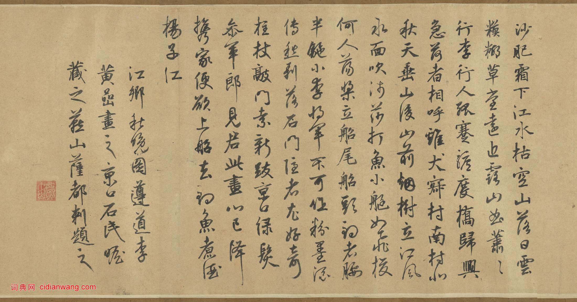 釋文:沙肥霜下江水枯。空山落日雲模糊。草堂遠近露山曲。蕭蕭行李行人孤。蹇驢度橋歸興急。荷者相呼雞犬寂。村南村北秋天垂。山後山前煙樹立。江風水面吹淺莎。打魚小艇如飛梭。何人蕩槳立船尾。船頭釣者腰半駝。小李將軍不可作。粉墨流傳愁剝落。石門隱者尤好奇。柱杖敲門索新跋。京口綠髮參軍郎。見君此畫心已降。攜家便欲上船去。釣魚煮酒揚子江。江鄉秋晚圖。遵道李黃喦畫之。京口石民瞻藏之。