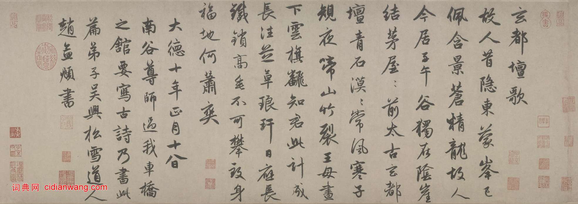 趙孟頫行書《為南谷尊師書玄都壇歌》,出自趙孟頫《行書三段》卷第二段,元,紙本,行書,縱31.1cm,橫100.2cm,書於元大德十年(1306年),作者時年53歲。,北京故宮博物院藏。
