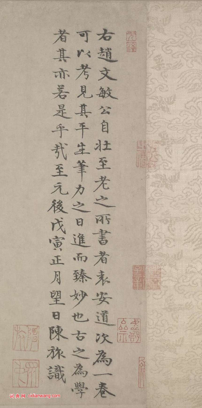 右趙文敏公自壯至老之所書者袁安道次為一卷,可以考見其平生筆力之日進,而臻妙也,古之為學者,其亦若是乎哉,至元後戊寅正月望日陳旅識。