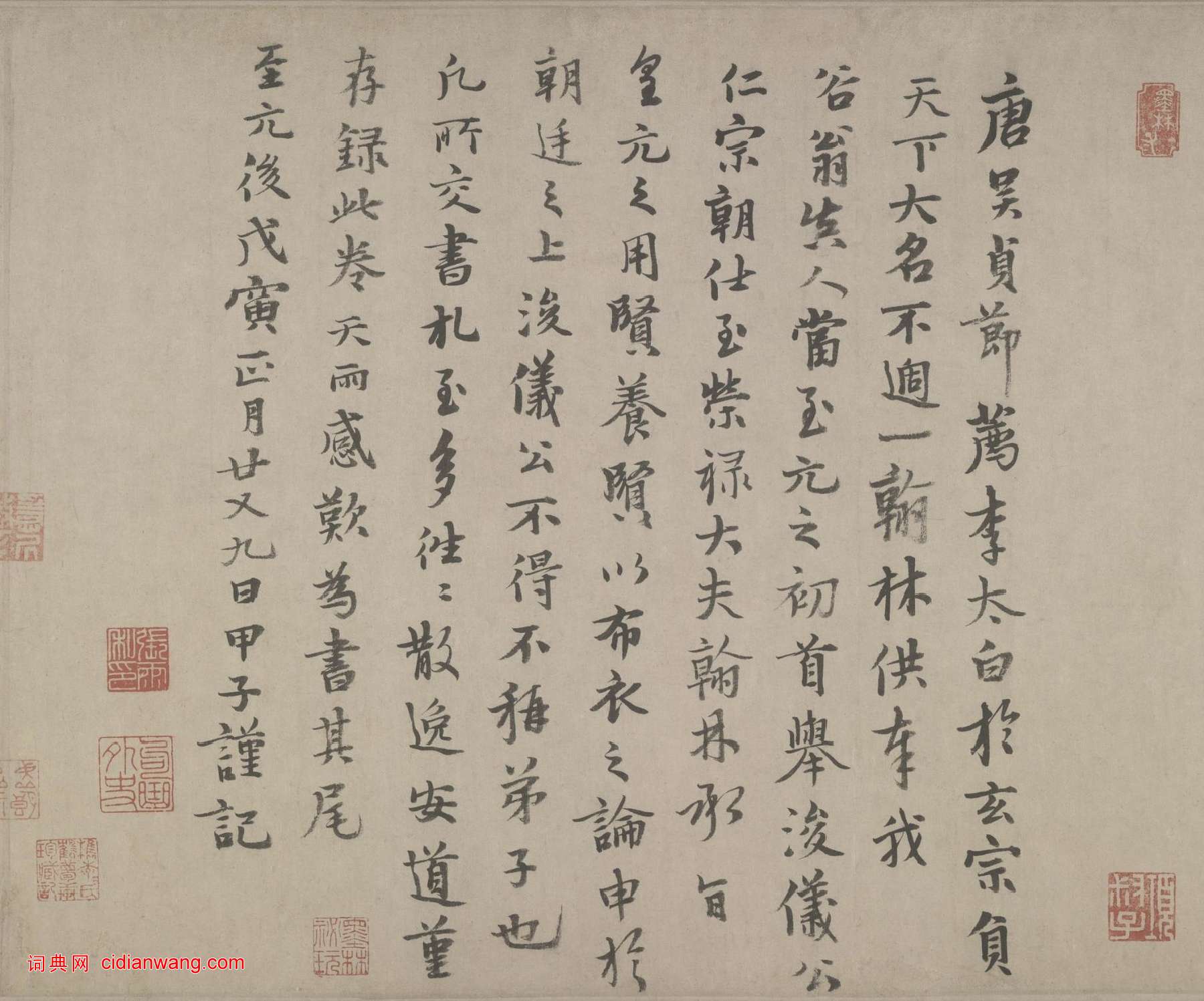 唐吳貞節薦李太白於玄宗,負天下大名不過一翰林供奉,我谷翁真人當至元之初首舉浚儀公,仁宗朝仕至榮祿大夫、翰林承旨皇元之用賢、養賢以布衣之論,申於朝廷之上,浚儀公不得不稱弟子也,凡所交書札至多,往往散逸安道,僅存録此卷,天雨感嘆,為書其尾,至元後戊寅正月二十九日甲子謹記。