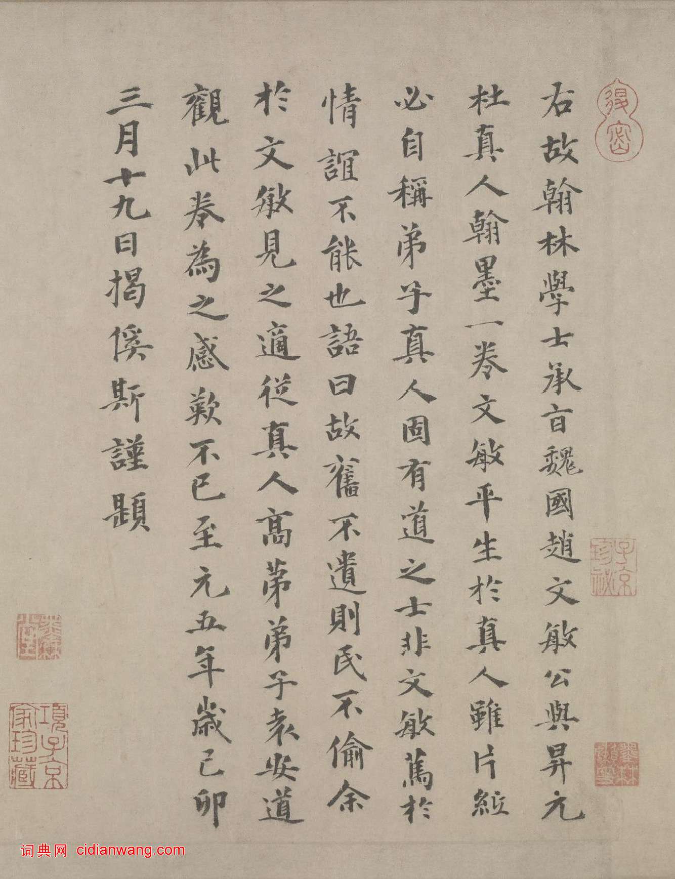 右故翰林學士承旨魏國趙文敏公,與升元杜真人翰墨一卷,文敏平生於真人雖片紙必自稱弟子,真人固有道之士,非文敏篤於情誼不能也,語曰故舊不遺則民不偷,余於文敏見之,適從真人高第弟子袁安道觀此卷,為之感嘆不已。