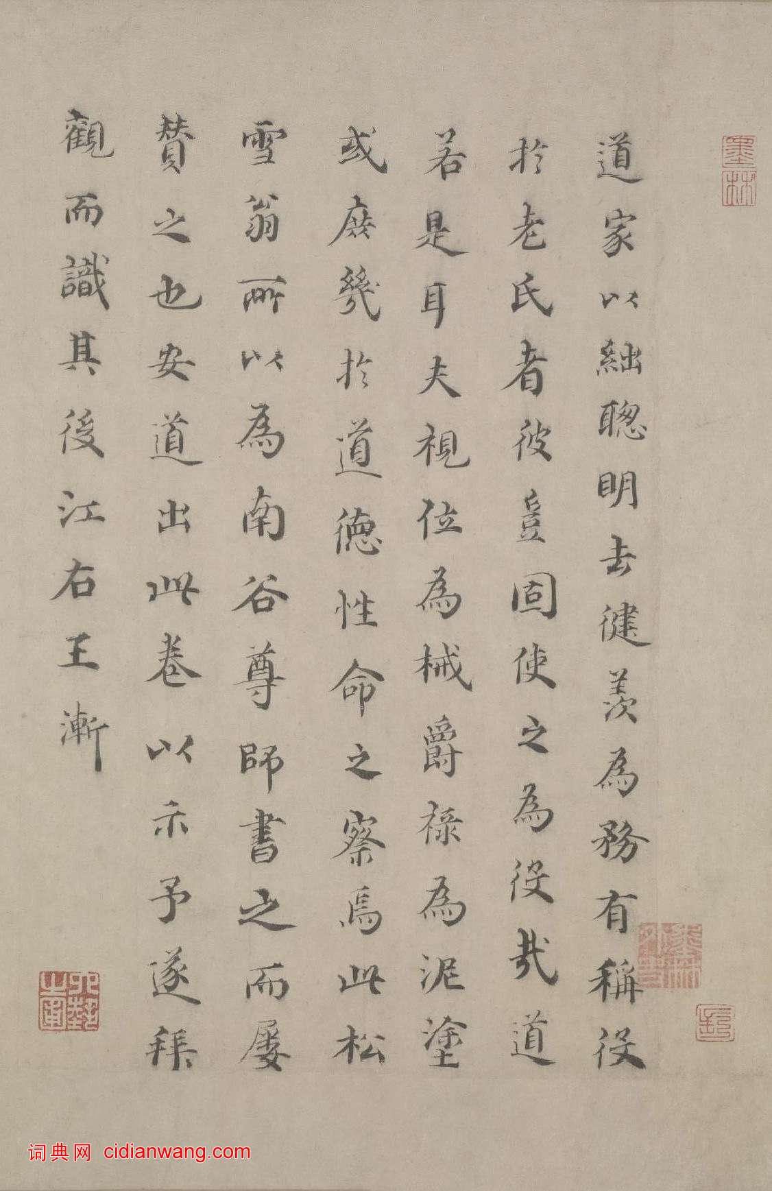 道家以絀聰明去健羨為務,有稱役於老氏者,彼豈固使之,為役哉道,若是耳,夫視位為械,爵祿為泥,塗或庶幾於道德性命之深焉,此松雪翁所以為南谷尊師書之,而屢贊之也,安道出此卷以示余,遂拜觀而識其後,江右王漸。