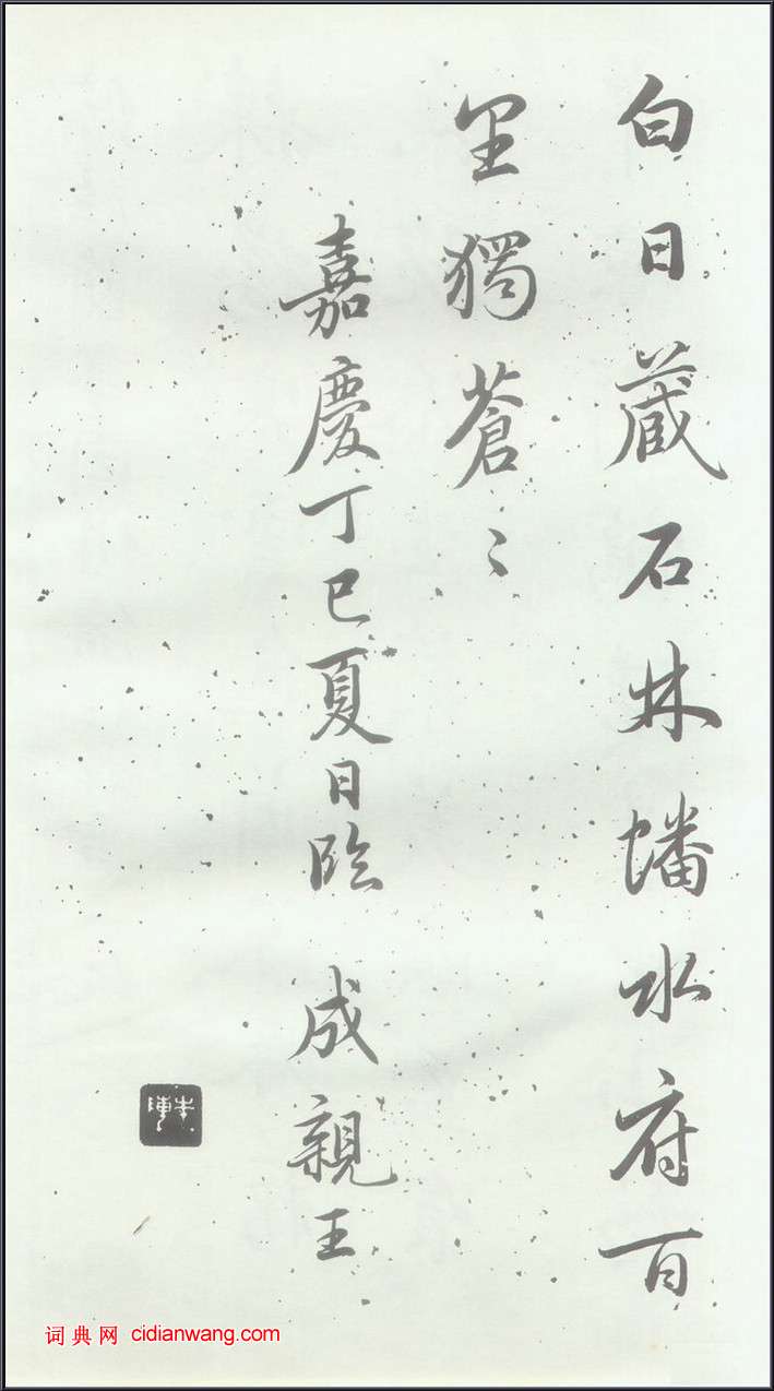 此帖為成親王藏本,後有成親王:“嘉慶丁巳(1797年)夏日”親筆跋。從時間上推測及點畫之完好如新看,此帖為初拓本,是和珅拓贈成親王的,和珅死後,家產被抄,拓本流傳極少,成親王將此帖和王羲之蘭亭序一同作為臨習範本,可見其評價之高,喜愛之深了。此帖後為著名美學家朱光潛先生收藏。(節錄自安徽美術出版社 許振軒《趙孟頫和他的千字文》)