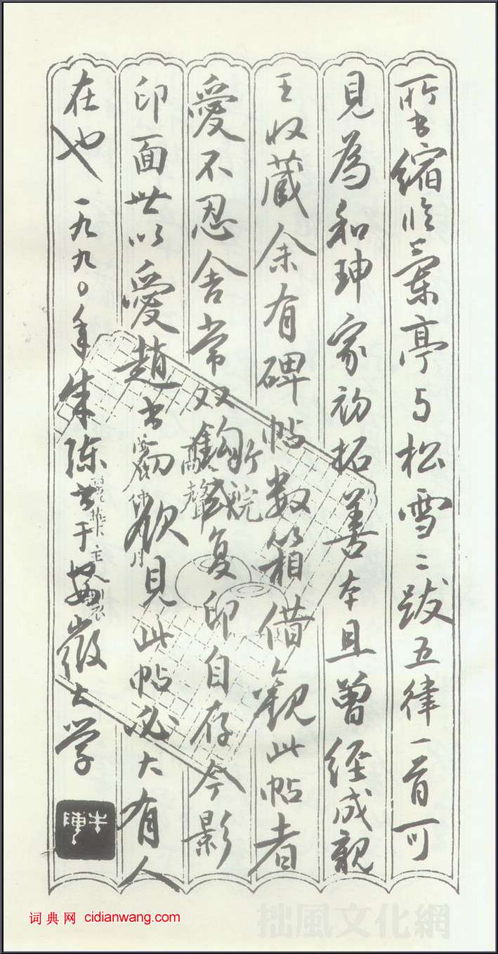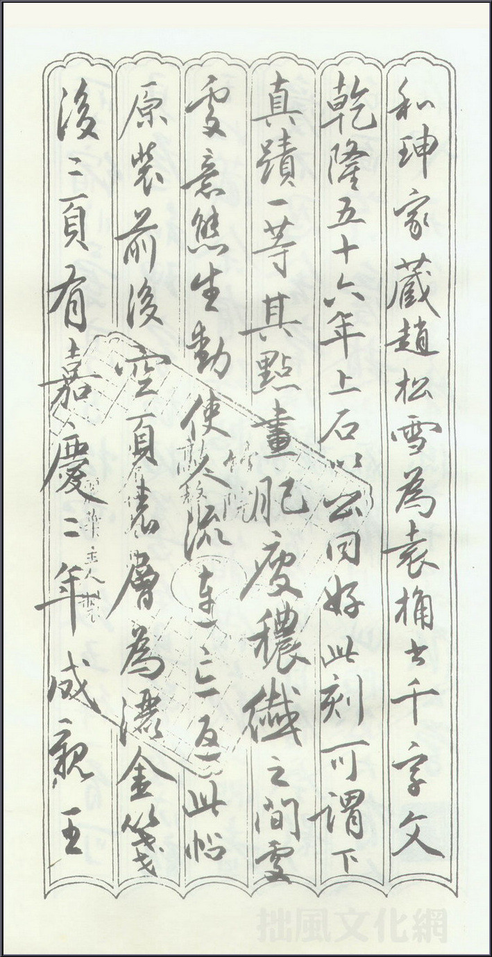 此貼刻於乾隆辛亥年(1791年),當時和珅正處於權勢的頂峰,勢傾朝野,富甲王侯,這邊千字文又是他極喜愛的,其鐫刻之考究精細,可以想見,試觀全帖,點畫之起落轉折,結體之承接揖讓,無不於法度之中,寓自然流轉之勢,朱陳先生謂其:“下真跡一等”,信非虛美。