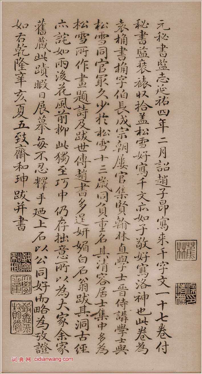 這本千字文是趙孟頫為其同官好友袁桷所書,為趙書中精品,莫雲卿曾題趙孟頫一絹本行書千字文云:“昔人謂方圓一萬里,上下數百年,絕無承旨(趙孟頫)書法,觀此本信然。此本之沉著穩便,非其指捥間得書法三昧,未易能也,此公千文倦,余所見亦不下數十種,而獨此為尤妙。”啟功先生亦云:“其書法乍看平正無奇,細觀之,精深厚重,於趙書諸跡中,允推巨擘。”這兩段話,移評此貼,我以為是允當的。