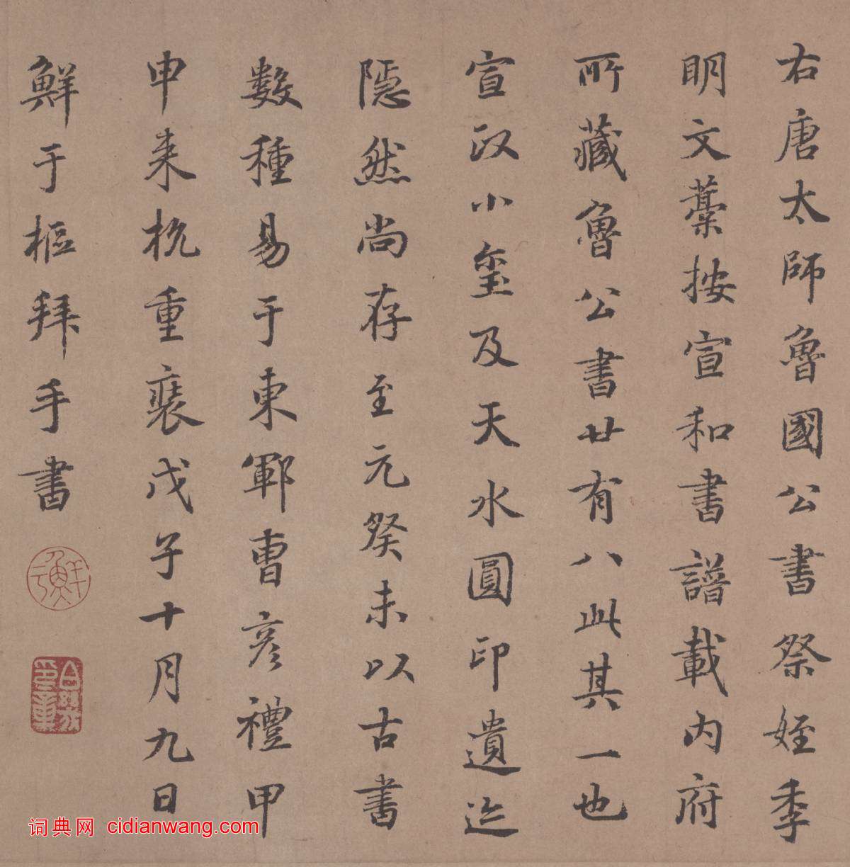 右唐太師魯國公書祭侄季明文稿。按《宣和書譜》載內府所藏魯公書廿有八,此其一也。宣政小璽及天水圓印,遺蹟隱然尚存。至元癸未,以古書數種,易於東鄆曹彥禮,甲申來杭重裝。戊子十有九日,鮮于樞拜手書。